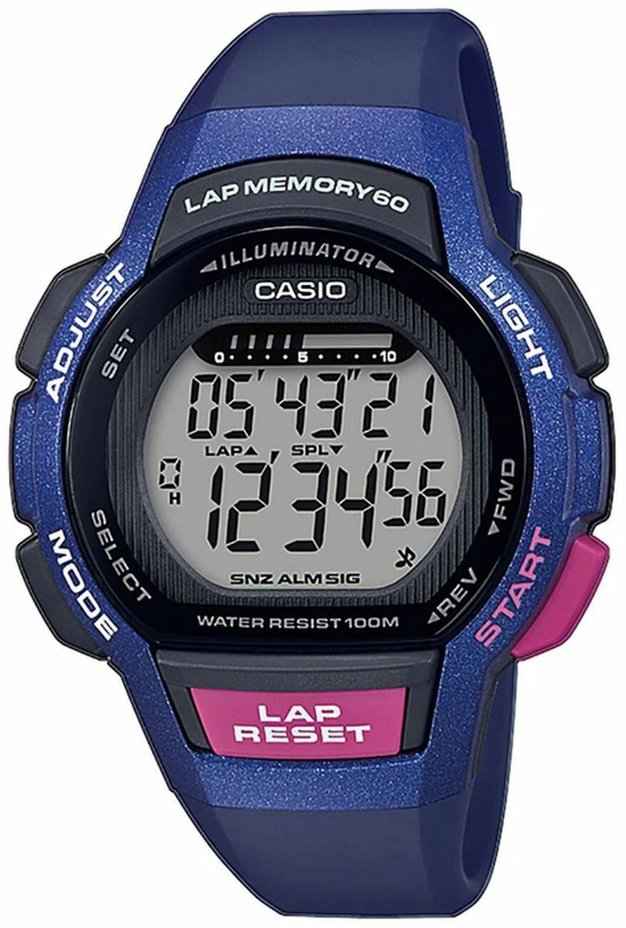Montre de sport pour femme Casio. Lumière LED : Pour que vous ayez tout sous les yeux même dans un environnement sombre, l’affichage de la montre est éclairé par une diode électroluminescente sur simple pression d’un bouton. Le temps écoulé, le temps intermédiaire et le temps final sont mesurés avec une précision au centième de seconde. La capacité de mesure de la montre est jusqu’à 100 heures. tours Dans cette mémoire, vous pouvez enregistrer les temps d’arrêt, de tour et intermédiaires mesurés, y compris la date, et les afficher à nouveau ultérieurement. Un enregistrement se compose de : date, temps d’arrêt, temps au tour et intermédiaires. La mémoire offre de la place pour jusqu’à 60 de ces enregistrements de données. Pour tous ceux qui veulent savoir exactement : le compte à rebours aide à se souvenir d’événements spéciaux ou récurrents en émettant un signal acoustique à l’heure définie. L’heure peut être réglée en minutes et jusqu’à 24 heures à l’avance. Cette fonction est particulièrement utile pour les médicaments quotidiens ou l’entraînement par intervalles. L’alarme quotidienne vous rappelle les événements quotidiens, un signal sonore retentit à l’heure programmée. Ce modèle dispose de trois alarmes indépendantes qui vous rappellent de manière flexible les rendez-vous importants. Fonction Snooze : Après avoir arrêté le signal d’alarme, celui-ci retentira à nouveau automatiquement après quelques minutes. Si vous le souhaitez, les tonalités des boutons peuvent être désactivées avec le bouton de mode. Après l’extinction, il n’y a plus de bip sonore lors du passage d’une fonction à l’autre. Les alarmes réglées ou les minuteries de compte à rebours sont toujours actives après la désactivation des tonalités des touches. Une fois réglé, le calendrier automatique affiche toujours la date correcte. L’affichage de l’heure peut être réglé au format 12 ou 24 heures. En mode 12 heures, un “p” à l’écran représente la seconde moitié de la journée, soit 12h à 23h59. Boîtier en résine. La résine se compose de résine synthétique et est le matériau idéal pour les bracelets en raison de son extrême durabilité et de sa flexibilité. La pile fournit à la montre l’énergie nécessaire pendant environ 5 ans.